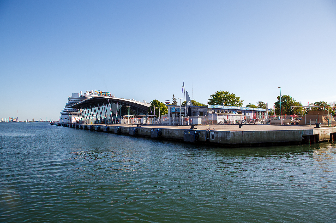 Blick am 15 Mai 2022 von der Fähre Warnemünde  - Hohe Düne der Weiße Flotte GmbH auf das Warnemünder Passagierkai, Pier 7 hinten das Warnemünde Cruise Center und dahinter am Pier 8, das gewaltige Kreuzfahrtschiff Norwegian Getaway. Rechts noch das Pier7 ein Shop und SB Restaurant mit Biergarten, davor (ganz rechts) mit einer Sand-Skulptur als Werbung für die 12. Warnemünder Sandwelt.