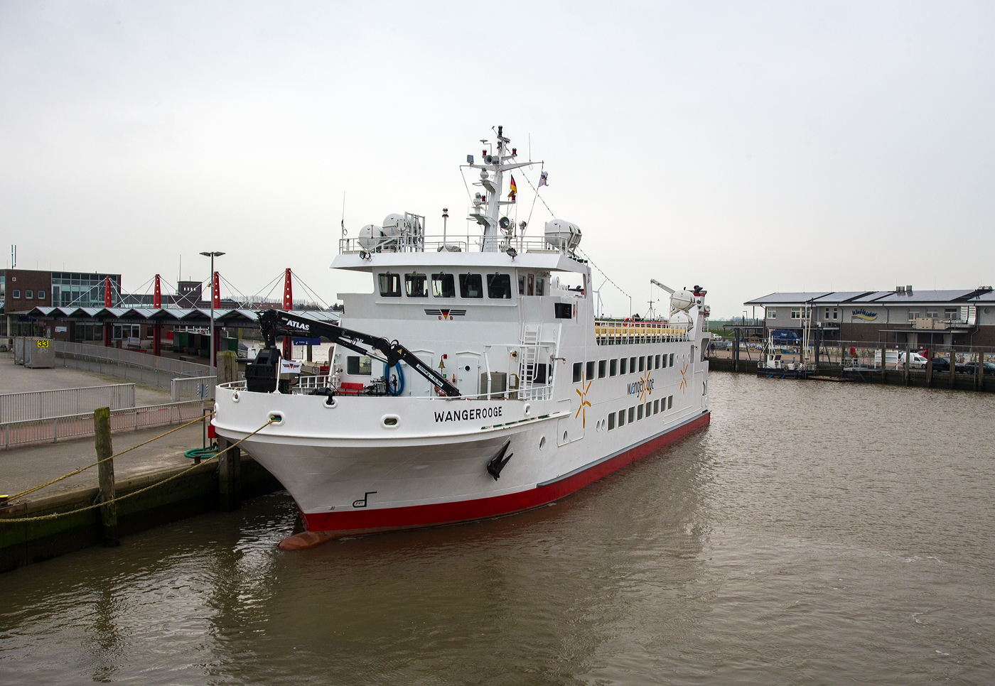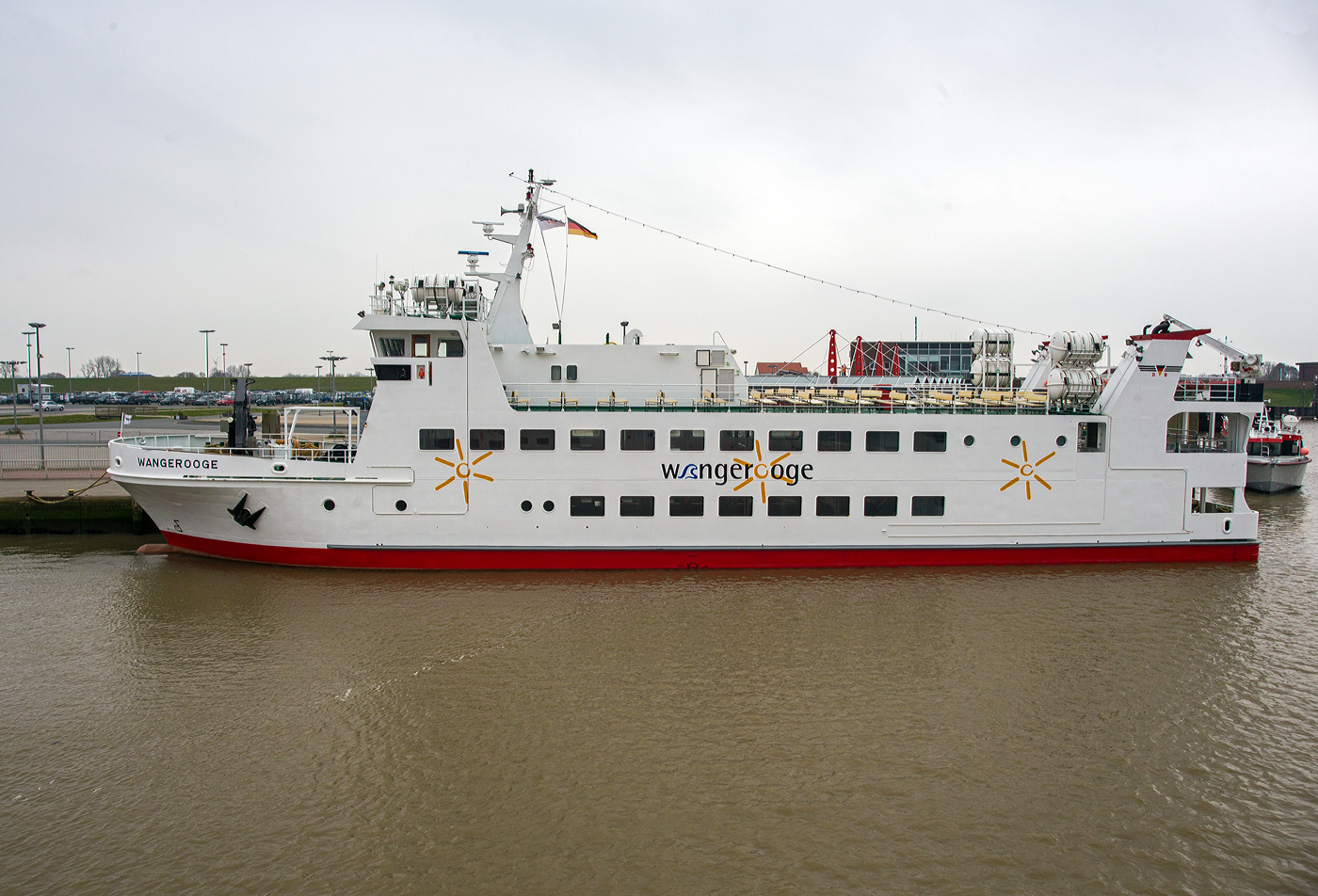 Die Fähre MS Wangerooge am 11 März 2024 am Anleger in Harlesiel. Die Wangerooge ist (neben der Harlingerland) eines der beiden regelmäßig zwischen der Nordseeinsel Wangerooge und Harlesiel eingesetzten Fährschiffe. Betrieben wird das Schiff im Auftrag der zur Deutschen Bahn AG gehörenden SIW Schifffahrt und Inselbahn Wangerooge durch die Reederei Warrings. Das Schiff von 1985 ersetzte ein Vorgängerschiff gleichen Namens von 1960, das ebenfalls auf der Husumer Schiffswerft GmbH Co.KG gebaut wurde. Das Schiff ist eine reine Personenfähre. Einzig das aufzugebende Gepäck der Reisenden wird in kleinen Containern auf dem Vorschiff transportiert. Die kleinen Container werden mit einem am Schiff montierten Kran auf das Vorschiff und später in Wangerooge auf die Inselbahn geladen. Trotz des geringen Tiefgangs der Wangerooge ist die Fährverbindung Wangerooge–Harlesiel tideabhängig. Der Fahrplan und die Abfahrtzeiten ändern sich so täglich, man muss genau in die Fahrpläne schauen. Die Fähre MS "Wangerooge" wurde speziell für das schwierige Revier konzipiert. TECHNISCHE DATEN: Länge über alles: 45,30 m Breite über alles:10,00 m Tiefgang (max.): 1,32 m Geschwindigkeit: 11,8 kn (22 km/h) Vermessung: 621 BRZ Verdrängung: 355,89 t Maschinenanlage: 4 Volvo Penta TAMD 121 C Dieselmotore Leistung (gesmat): 1.080 kW (1.468 PS) Höchstgeschwindigkeit: 11,8 kn (22 km/h) Propeller: 2 Platzkapazität im Sommer: 760 Personen Platzkapazität im Winter: 480 Personen
