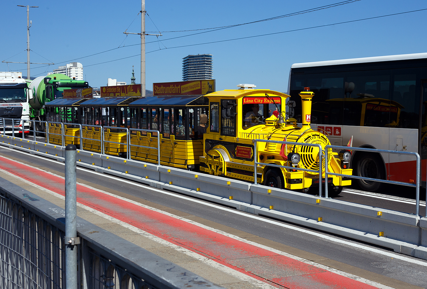 Ein Petit Train, gezogen von „Niklas“ einem Muson River 1894 vom italienischen Hersteller DOTTO TRAINS mit 3 Anhänger, des Geiger´s Linz City Express am 04 April 2025 auf der Donau überspannenden Nibelungenbrücke in Linz, in Fahrtrichtung Hauptplatz. (zum Bild)